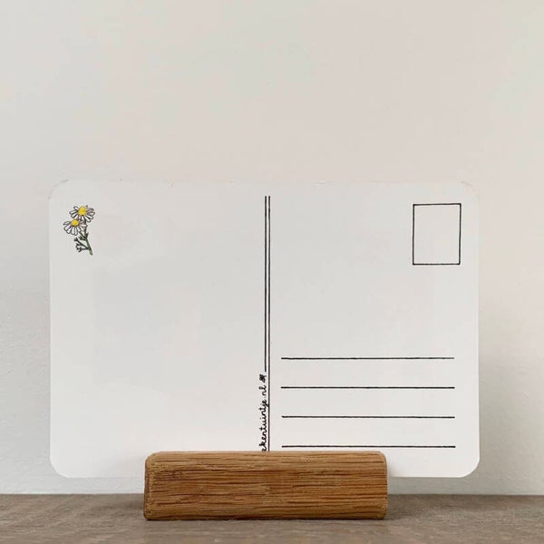Dit kaartje is 9x13 cm en is gedrukt op stevig biotop-papier. De achterzijde heeft adreslijntjes zodat je hem als ansichtkaart kunt versturen.